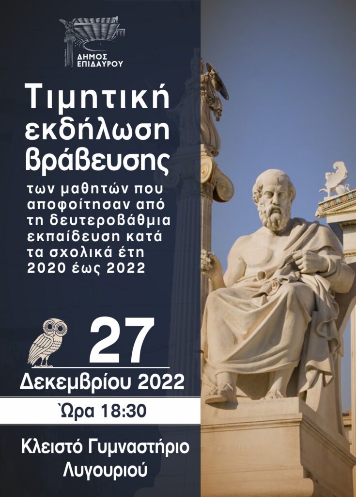 Ο Δήμος Επιδαύρου θα πραγματοποιήσει τιμητική εκδήλωση βράβευσης, των μαθητών που αποφοίτησαν από τη δευτεροβάθμια εκπαίδευση κατά τα σχολικά έτη 2020 έως 2022.