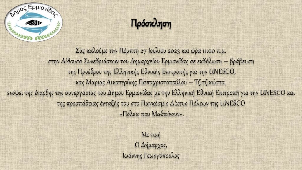 Σας καλούμε την Πέμπτη 27 Ιουλίου 2023 και ώρα 11:00 π.μ. στην Αίθουσα Συνεδριάσεων του Δημαρχείου Ερμιονίδας σε εκδήλωση – βράβευση της Προέδρου της Ελληνικής Εθνικής Επιτροπής για την UNESCO, κας Μαρίας Αικατερίνης Παπαχριστοπούλου – Τζιτζικώστα,