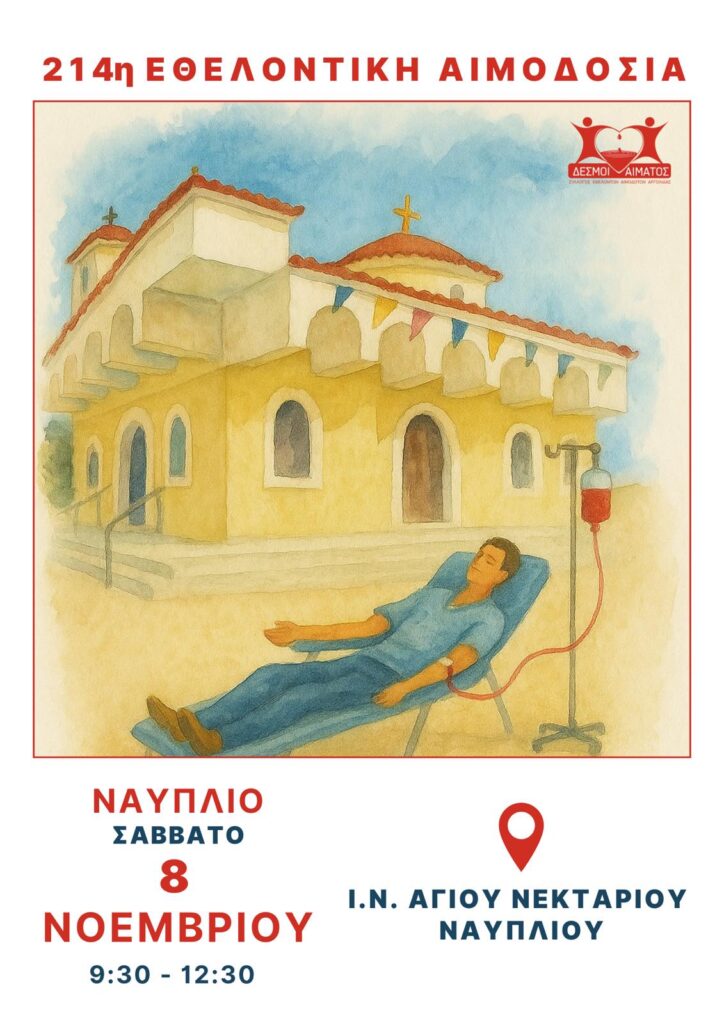Έλα στη 214η Εθελοντική Αιμοδοσία στον Ι. Ν. Αγίου Νεκταρίου στο Ναύπλιο.