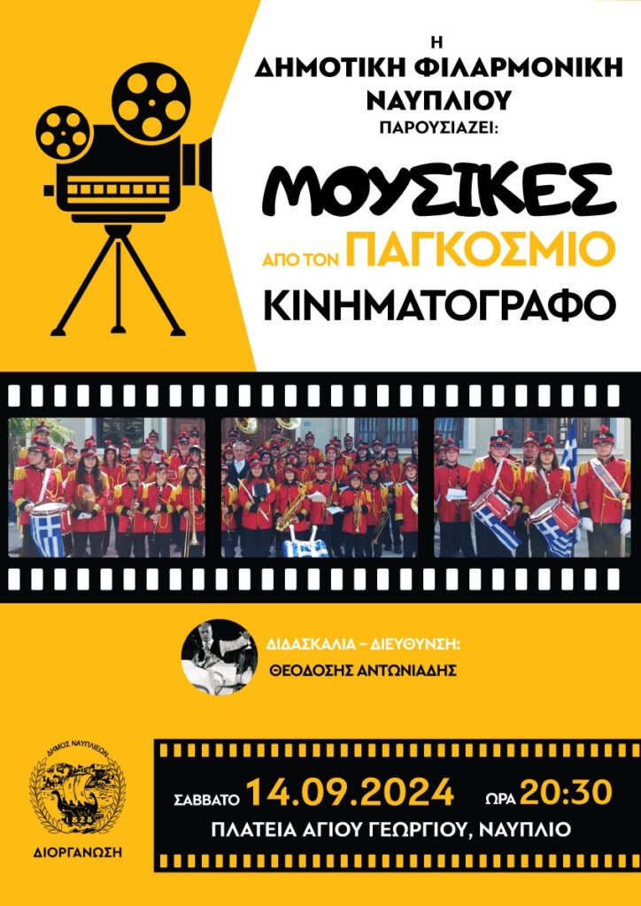 Το Σάββατο 14 Σεπτεμβρίου 2024, στην πλατεία του Ιερού Ναού Αγίου Γεωργίου στο Ναύπλιο, στις 20.30, θα πραγματοποιηθεί συναυλία από τη Δημοτική Φιλαρμονική Ναυπλίου. Τα μέλη της Δημοτικής Φιλαρμονικής, υπό τη διδασκαλία και διεύθυνση του αρχιμουσικού Θεοδόση Αντωνιάδη, έχουν ετοιμάσει ένα όμορφο πρόγραμμα με “Μουσικές από τον παγκόσμιο κινηματογράφο”.