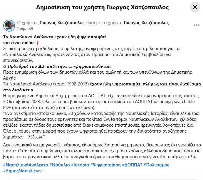 ΥΓ4. Η ανάρτηση του Γιώργου Χατζόπουλου που χρησιμοποίησε ο δημότης με το σχόλιό του.
