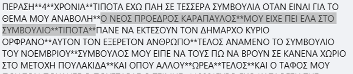 Το πιο σημαντικό όμως είναι πως κατονομάζει το νέο Πρόεδρο του Δημοτικού Συμβουλίου, Κώστα Καράπαυλο αναφέροντας ότι τον κάλεσε να έρθει στο Δημοτικό Συμβούλιο Ναυπλιέων όπου συζητιόταν ο Κανονισμός των Κοιμητηρίων για να πει το πρόβλημά του.