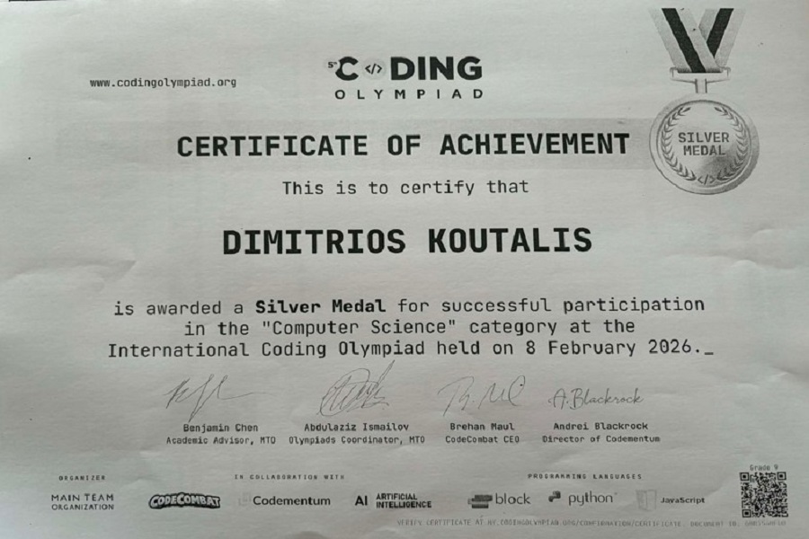 Μια σημαντική διεθνή διάκριση πέτυχε ο μαθητής της Γ΄ Γυμνασίου του Μουσικού Σχολείου Αργολίδας, Δημήτριος Κουταλής, ο οποίος κατέκτησε το Ασημένιο Μετάλλιο στη διεθνή διοργάνωση International Coding Olympiad, λύνοντας απαιτητικά προβλήματα λογικής σκέψης, αλγοριθμικής και υπολογιστικής επιστήμης.