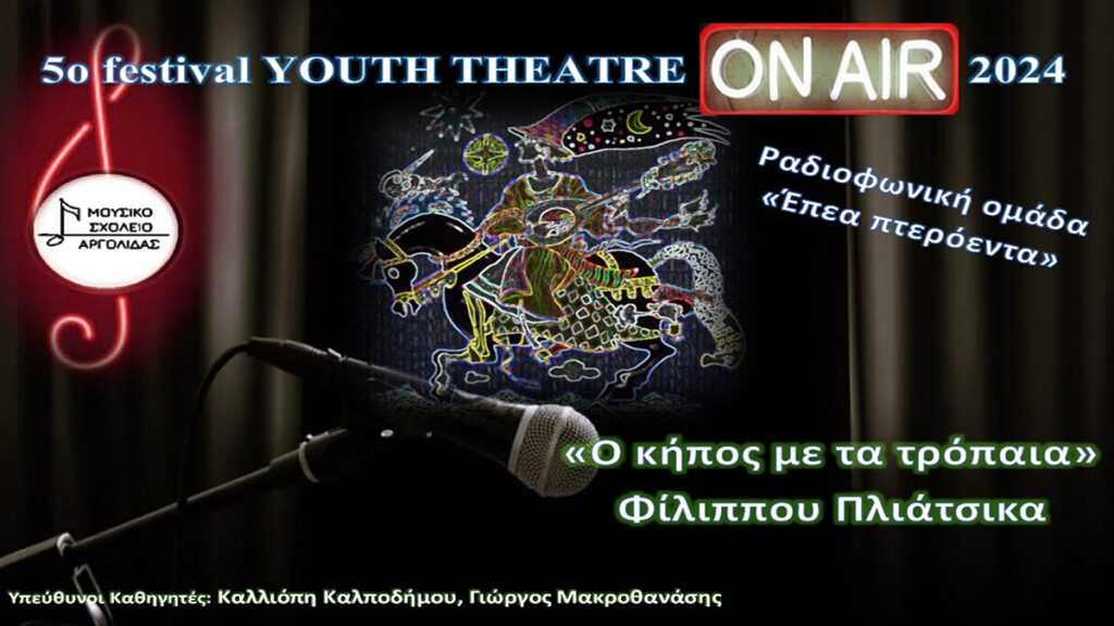 Είναι γνωστές οι καλλιτεχνικές ευαισθησίες στη σύνθεση και μουσική απόδοση του Φίλιππου Πλιάτσικα. Είναι επίσης γνωστές οι καλλιτεχνικές ευαισθησίες και οι σκηνογραφικές/σκηνοθετικές ιδέες ανανέωσης που επιχειρεί με φαντασία και κοπιαστική εργασία η Φιλόλογος-Θεατρολόγος Καλλιόπη Καλποδήμου, συμμετέχοντας ενεργά στην επιτυχημένη πορεία του Μουσικού Σχολείου Αργολίδας, αλλά και άλλων εκτός σχολείου εκδηλώσεων που αναλαμβάνει. Αυτή τη φορά συνεργάστηκε με έναν άλλο άξιο εκπαιδευτικό και μουσικό, τον Γιώργο Μακροθανάση συμμετέχοντας σε ένα Διεθνή Θεατρικό Διαγωνισμό Νέων, τον «Youth Theatre on air». Ουσιαστικά πρόκειται για ένα διεθνές φεστιβάλ «ραδιοφωνικού θεάτρου» (μας θύμισαν την παλιά εκπομπή «το Θέατρο στο Ραδιόφωνο» με χιλιάδες ακροατές σε όλη την Ελλάδα), προϊόν της συνεργασίας ανάμεσα στο Θεατρικό kαλλιτεχνικό Κέντρο «Πούπουλο» (Θεσσαλονίκη), το ίδρυμα Motivation in Arts (Kύπρος) και το Creative Drama & Arts Centre (Αυστραλία). Στο πλαίσιο αυτού του Φεστιβάλ δημιουργήθηκε από τους δυο εκπαιδευτικούς του Μουσικού Σχολείου η καλλιτεχνική ομάδα «Έπεα Πτερόεντα», η οποία συμμετείχε στην 5η Διεθνή Ραδιοφωνική Συνάντηση «Θέατρο μπροστά σ’ ένα μικρόφωνο» (Creative International Digital Encounter Children & Youth Performing ON AIR-2024).
