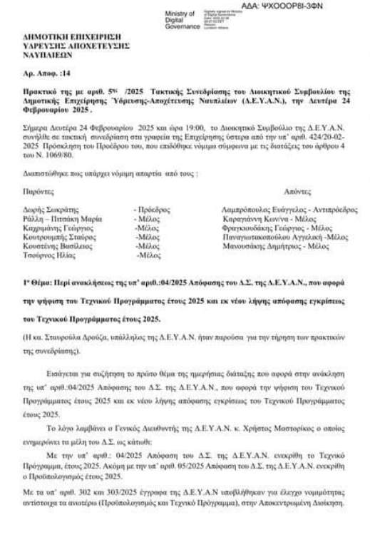 Το πρακτικό της συνεδρίασης του Διοικητικού Συμβουλίου της ΔΕΥΑΝ για το Τεχνικό Πρόγραμμα 2025 με απόντες τους Δημοτικούς Συμβούλους του Ορφανού