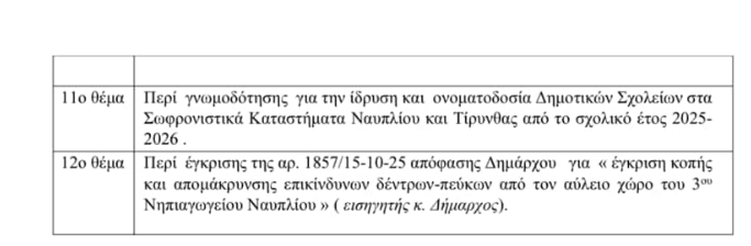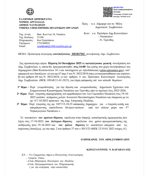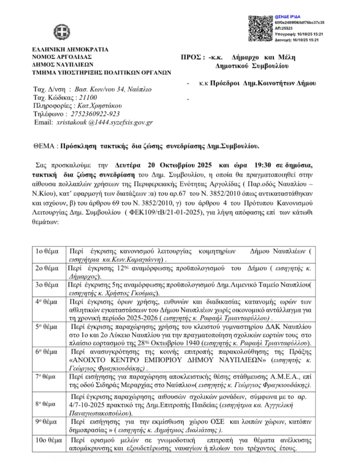 Η νέα πρόσκληση για την τακτική συνεδρίαση της Δευτέρας 20 Οκτωβρίου που συμπεριλαμβάνει τα σημερινά “κατεπείγοντα” θέματα