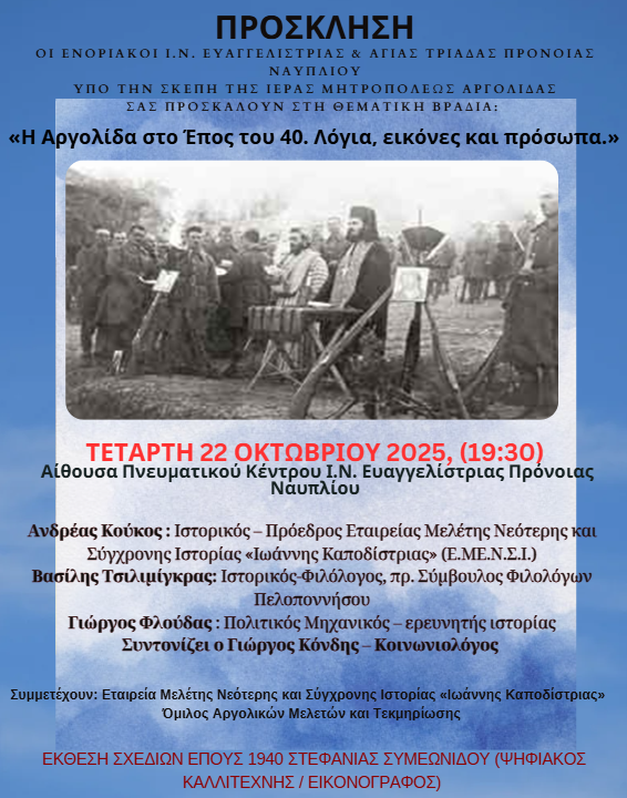 Μια πολυδιάστατη παρουσίαση του Έπους του ’40 θα παρουσιάσουμε στην εκδήλωση- αφιέρωμα στο Πνευματικό Κέντρο του Ι.Ν. Ευαγγελίστριας την Τετάρτη 22 Οκτωβρίου 2025 και ώρα 19:30. Θα παρουσιάσουν: