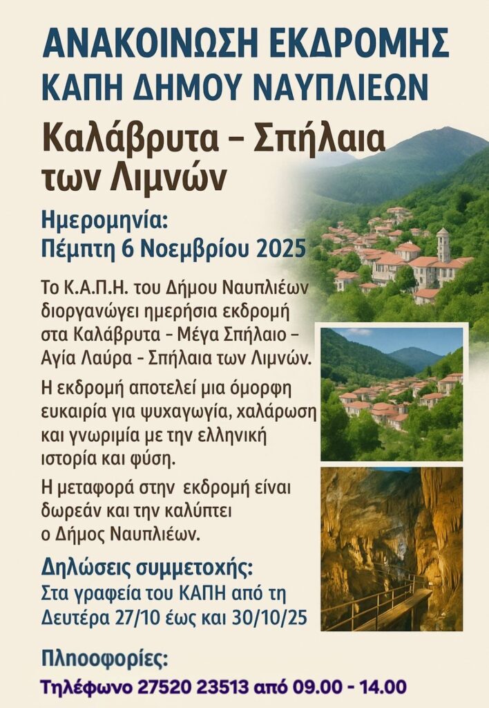 Το Κ.Α.Π.Η. του Δήμου Ναυπλιέων διοργανώνει ημερήσια εκδρομή στα Καλάβρυτα – Μέγα Σπήλαιο- Αγια Λαύρα-Σπήλαια των Λιμνών.