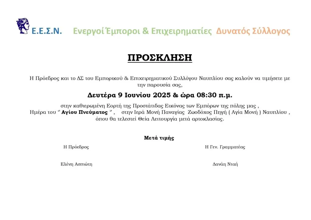 Ο Εμπορικός και Επιχειρηματικός Σύλλογος Ναυπλίου σας προσκαλεί στην εορτή των Εμπόρων της πόλης μας του Αγίου Πνεύματος.
