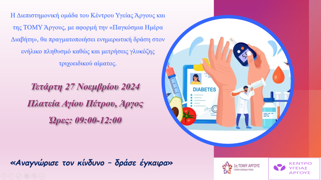 Η Διεπιστημονική ομάδα του Κέντρου Υγείας Άργους και της ΤΟΜΥ Άργους, με αφορμή την «Παγκόσμια Ημέρα Διαβήτη », θα πραγματοποιήσει ενημερωτική δράση στον ενήλικο πληθυσμό με τίτλο «Αναγνώρισε τον κίνδυνο – δράσε έγκαιρα» καθώς και μετρήσεις γλυκόζης τριχοειδικού αίματος, την Τετάρτη 27 Νοεμβρίου 2024, στην Πλατεία Αγίου Πέτρου, στο Άργος από τις 09:00 το πρωί έως τις 12:00 το μεσημέρι.