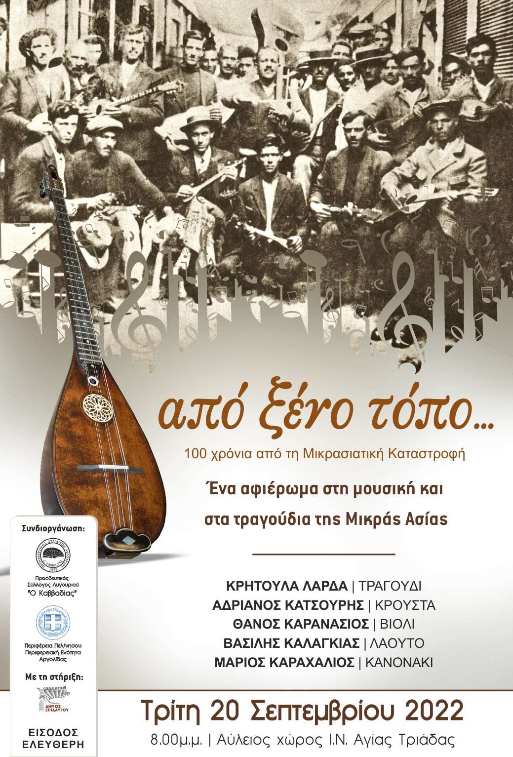 Η Περιφέρεια Πελοποννήσου – Περιφερειακή Ενότητα Αργολίδας σε συνδιοργάνωση με τον Προοδευτικό Σύλλογο Λυγουριού «Ο Καββαδίας» σας προσκαλούν σε μια εξ αναβολής, μουσική βραδιά-αφιέρωμα στα 100 χρόνια από τη Μικρασιατική Καταστροφή, την Τρίτη 20 Σεπτεμβρίου 2022. Σας περιμένουμε για να ταξιδέψουμε μελωδικά πίσω στο χρόνο, να τιμήσουμε τη γενιά της προσφυγιάς, που με μοναδικό σθένος έχτισε μια νέα ζωή φέρνοντας μαζί τα ιδιαίτερα πολιτιστικά στοιχεία της.