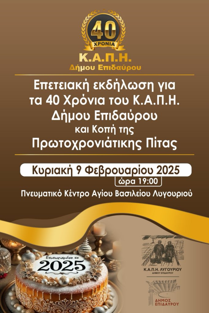 Επετειακή εκδήλωση για τα 40 χρόνια του Κ.Α.Π.Η. του Δήμου Επιδαύρου και κοπή της πρωτοχρονιάτικης πίτας θα πραγματοποιηθεί στο Πνευματικό Κέντρο του Αγίου Βασιλείου στο Λυγουριό, την Κυριακή 9 Φεβρουαρίου 2025.