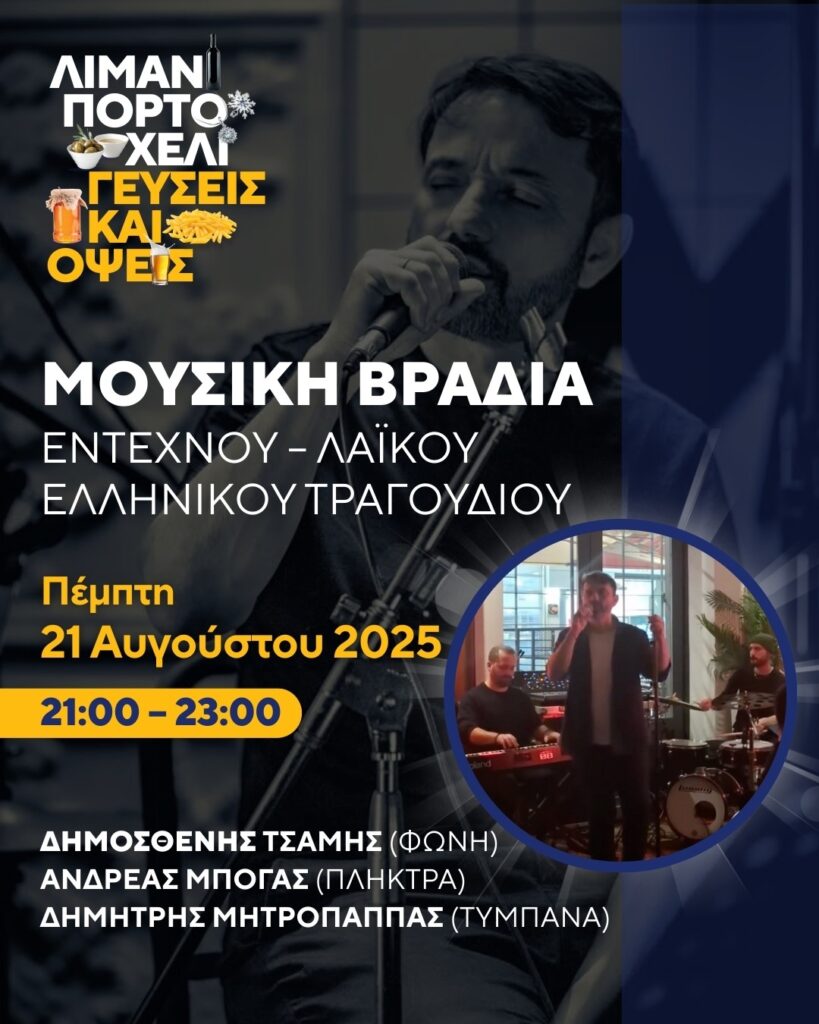 21:00 – 23:00 | Μουσική βραδιά Έντεχνου – Λαϊκού Ελληνικού Τραγουδιού με τον Δημοσθένη Τσάμη (φωνή), τον Ανδρέα Μπογά (πλήκτρα) και τον Δημήτρη Μητρόπαππα (τύμπανα)