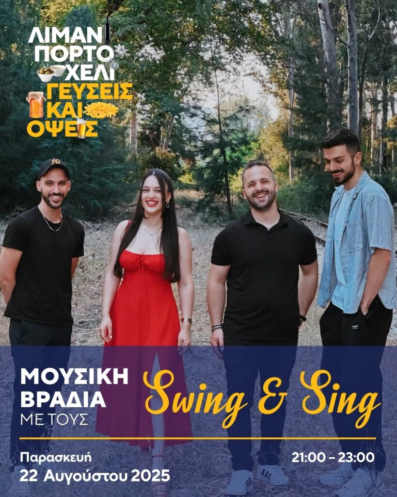 21:00 – 23:00 | Μουσική βραδιά γεμάτη ρυθμό, με ελληνικό και ξένο ρεπερτόριο με τους «Swing & Sing»