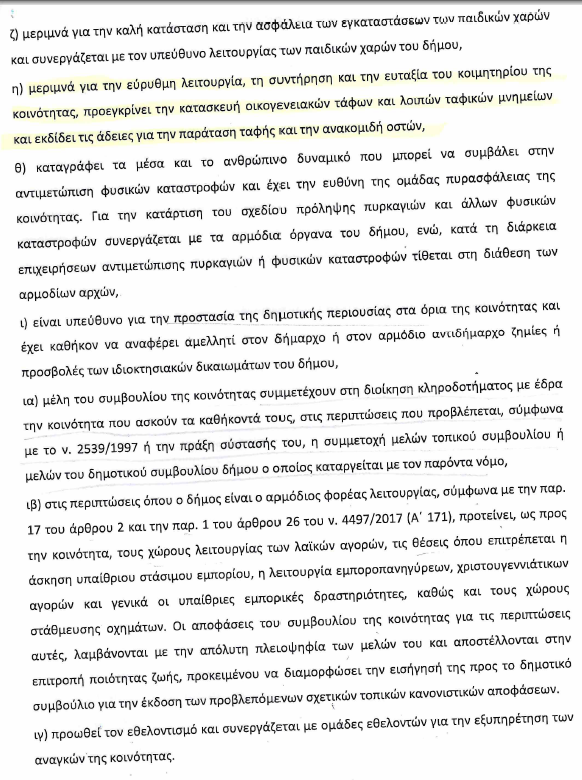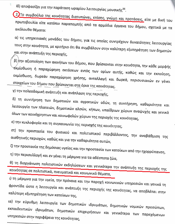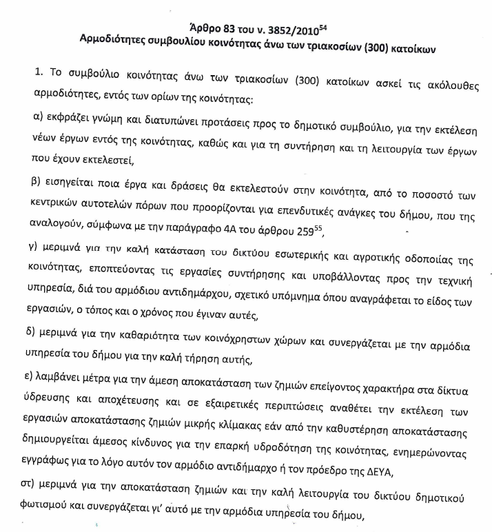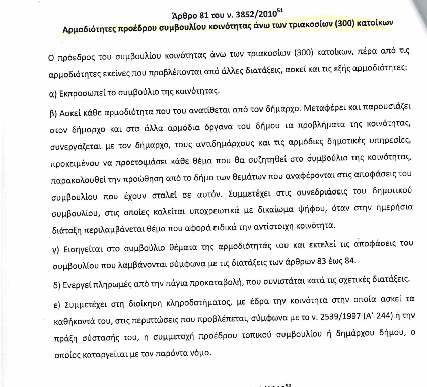 Τα άρθρα 81 και 83 του νόμου 3852/2010 με τις αρμοδιότητες του Προέδρου και του Κοινοτικού Συμβουλίου, προς ενημέρωση του κ. Μαργέτα, του κ. Αγρίμη και της κ. Αλεξανδρή.