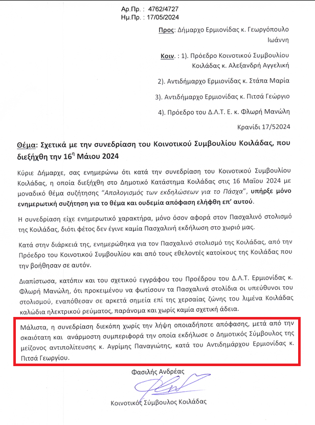 Τα παραπάνω, πέραν όλων των παρισταμένων, επιβεβαιώνονται και από το υπ. αριθμ. πρωτ. 4762/4727-17/05/2024 έγγραφο του Κοινοτικού Συμβούλου Κοιλάδας κ. Φασιλή Ανδρέα προς τον Δήμαρχο Ερμιονίδας: