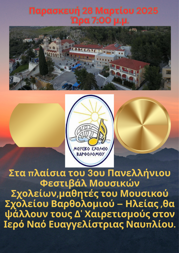 Στις 28 Μαρτίου 2025,στα πλαίσια του 3ου Πανελλήνιου Φεστιβάλ Μουσικών Σχολείων, μαθητές του Μουσικού Σχολείου Βαρθολομιού – Ηλείας, θα ψάλλουν τους Δ΄ Χαιρετισμούς στον Ιερό Ναό Ευαγγελίστριας Ναυπλίου.