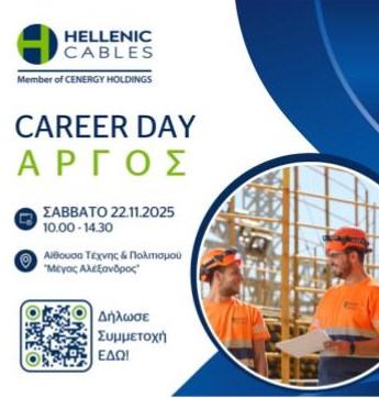 Η Hellenic Cables, μέλος της Cenergy Holdings και ένας από τους κορυφαίους παραγωγούς καλωδίων στην Ευρώπη, διοργανώνει Ημέρα Καριέρας στο Άργος το Σάββατο 22 Νοεμβρίου 2025, 10:00-14:30, στην Αίθουσα Τέχνης & Πολιτισμού “Μέγας Αλέξανδρος”.