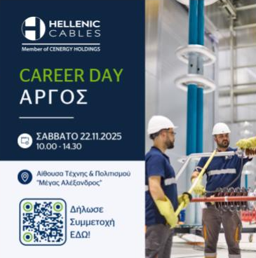 Η Hellenic Cables, μέλος της Cenergy Holdings και ένας από τους κορυφαίους παραγωγούς καλωδίων στην Ευρώπη, διοργανώνει Ημέρα Καριέρας στο Άργος το Σάββατο 22 Νοεμβρίου 2025, 10:00-14:30, στην Αίθουσα Τέχνης & Πολιτισμού “Μέγας Αλέξανδρος”.