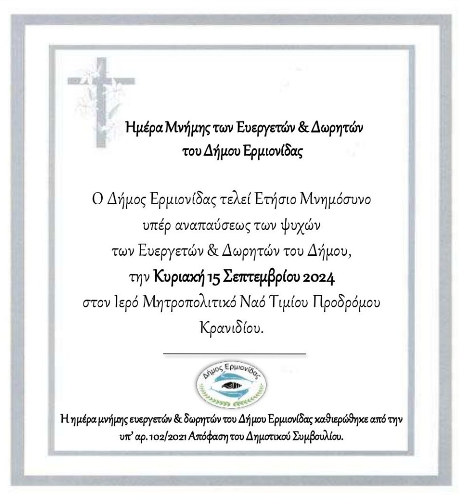 Ο Δήμος Ερμιονίδας τελεί Ετήσιο Μνημόσυνο υπέρ αναπαύσεως των ψυχών των Ευεργετών & Δωρητών του Δήμου, την Κυριακή 15 Σεπτεμβρίου 2024 στον Ιερό Μητροπολιτικό Ναό Τιμίου Προδρόμου Κρανιδίου.