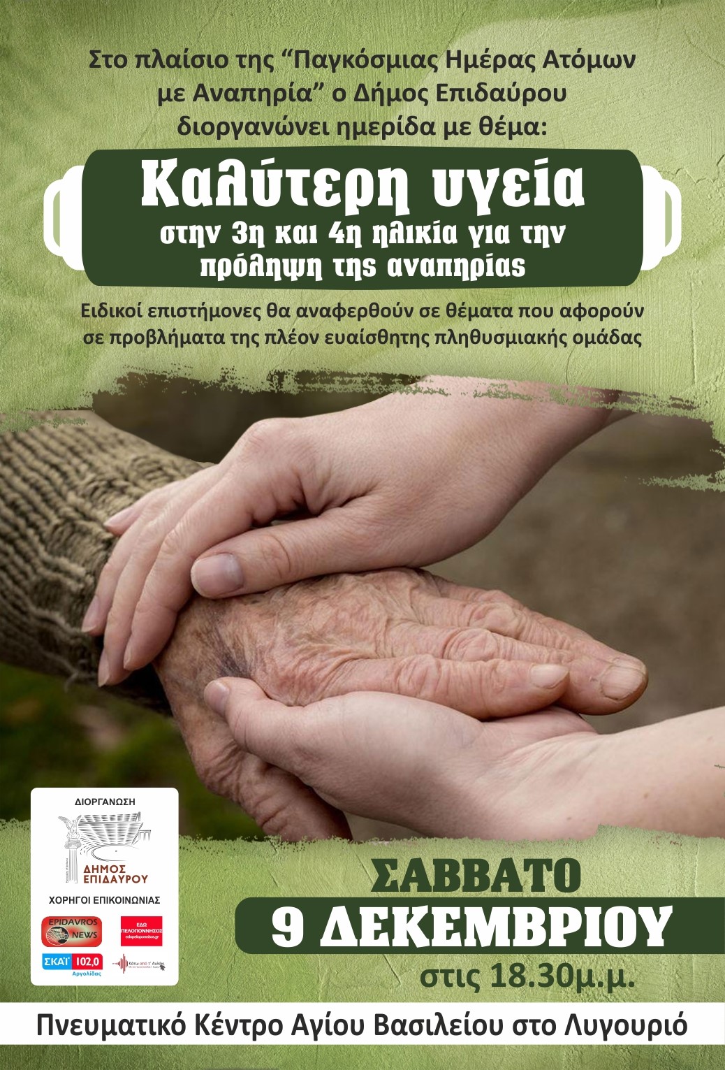 Στο πλαίσιο της “Παγκόσμιας Ημέρας Ατόμων με Αναπηρία ” ο Δήμος Επιδαύρου διοργανώνει ημερίδα με θέμα: “Καλύτερη υγεία στην 3η και 4η ηλικία για την πρόληψη της αναπηρίας”.