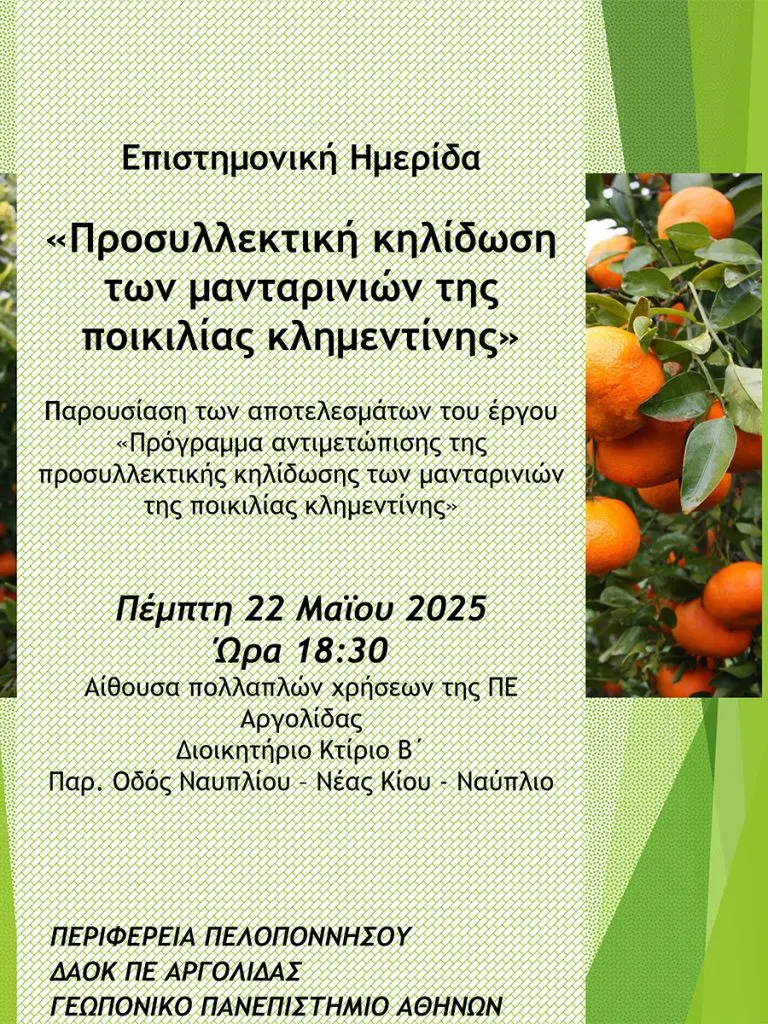 Μία ιδιαίτερα σημαντική επιστημονική ημερίδα με θέμα «Προσυλλεκτική κηλίδωση των μανταρινιών της ποικιλίας κλημεντίνης» θα πραγματοποιηθεί την Πέμπτη 22 Μαΐου 2025, στις 18:30, στην Αίθουσα Πολλαπλών Χρήσεων της Περιφερειακής Ενότητας Αργολίδας.