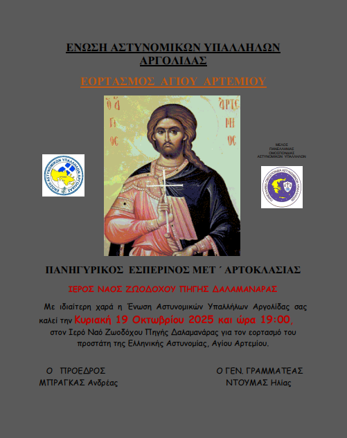 Με ιδιαίτερη χαρά η Ένωση Αστυνομικών Υπαλλήλων Αργολίδας σας καλεί την Κυριακή 19 Οκτωβρίου 2025 και ώρα 19:00, στον Ιερό Ναό Ζωοδόχου Πηγής Δαλαμανάρας για τον εορτασμό του προστάτη της Ελληνικής Αστυνομίας, Αγίου Αρτεμίου.