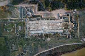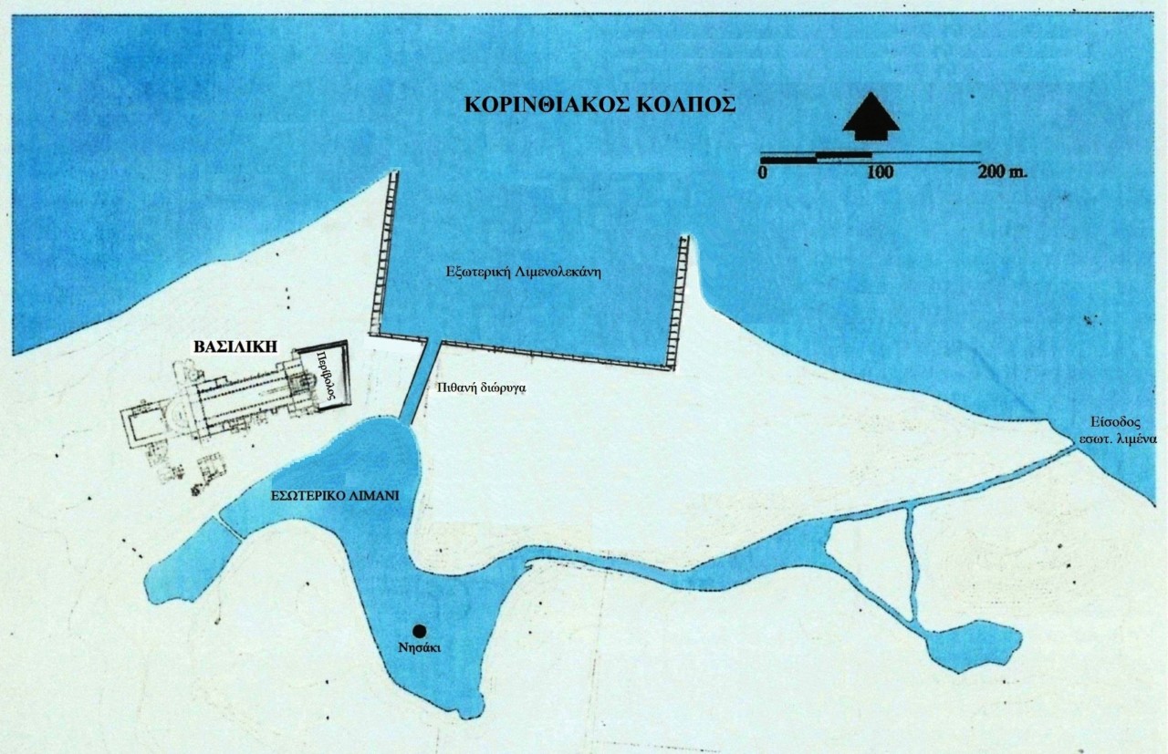 οικοδομήματα που θα μπορούσαν να περιορίζουν τη θέα. Βόρεια και νότια ήταν η θάλασσα και το εσωτερικό λιμάνι, στα ανατολικά η πιθανή διώρυγα που συνέδεε τον εξωτερικό με τον εσωτερικό λιμένα, ενώ στα δυτικά δεν εντοπίστηκε μέχρι σήμερα κάποια κατασκευή (Εικ.3). Το εσωτερικό λιμάνι, ιδίως η λεκάνη που ήταν κοντά στη βασιλική έφερε σε τμήμα του περιγράμματος κτιστή κρηπίδα ένα είδος προκυμαίας, στην οποία τα πλοία είχαν πρόσβαση. Έτσι η βασιλική ήταν εύκολα προσπελάσιμη και από το εσωτερικό λιμάνι. Το ίδιο μπορούμε να θεωρήσουμε ότι ίσχυε και για το εξωτερικό λιμάνι, του οποίου ο δυτικός μόλος- πρόβολος βρισκόταν κοντά στον ναό όπου κατά τις ήσυχες ημέρες μπορούσαν να αποβιβασθούν ταξιδιώτες και πιστοί.