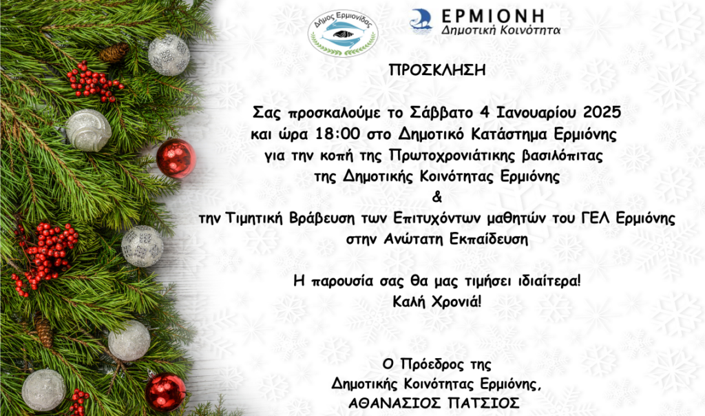 Σας προσκαλούμε το Σάββατο 4 Ιανουαρίου 2025 και ώρα 18:00 στο Δημοτικό Κατάστημα Ερμιόνης για την κοπή της Πρωτοχρονιάτικης βασιλόπιτας της Δημοτικής Κοινότητας Ερμιόνης & την Τιμητική Βράβευση των Επιτυχόντων μαθητών του ΓΕΛ Ερμιόνης στην Ανώτατη Εκπαίδευση.