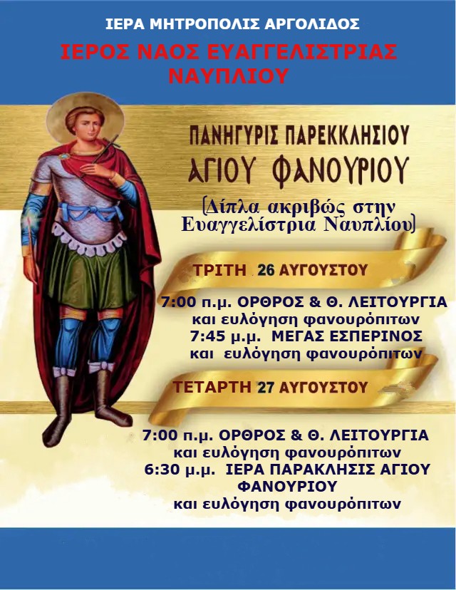 Στις 27 Αυγούστου, εορτή του Αγίου ενδόξου Μεγαλομάρτυρος Φανουρίου, πανηγυρίζει το Ιερό Παρεκκλήσιο Αγίου Φανουρίου του Ιερού Ναού «ΕΥΑΓΓΕΛΙΣΤΡΙΑΣ» Ναυπλίου, το οποίο βρίσκεται ακριβώς δίπλα στον Ιερό Ναό της «ΕΥΑΓΓΕΛΙΣΤΡΙΑΣ».
