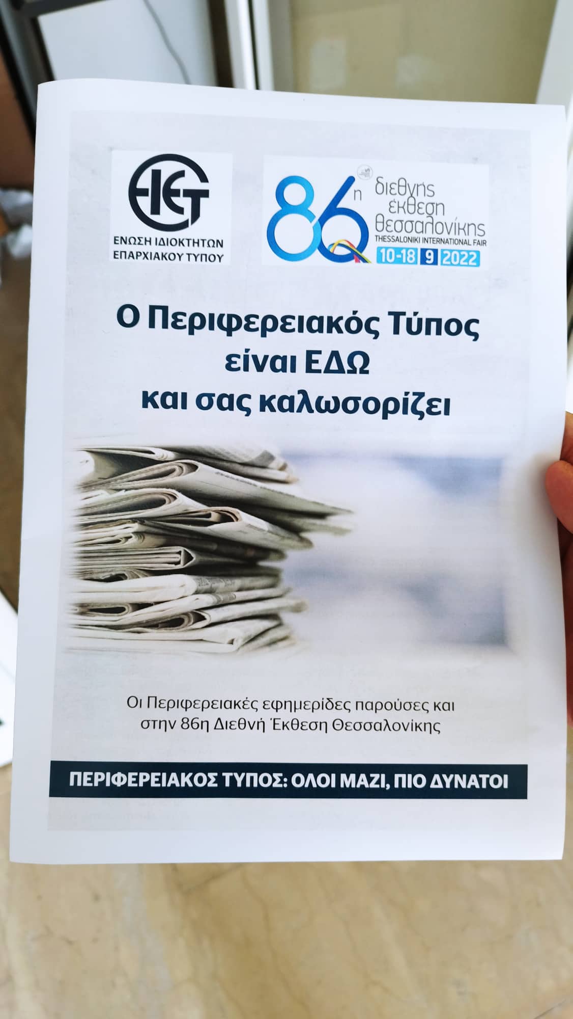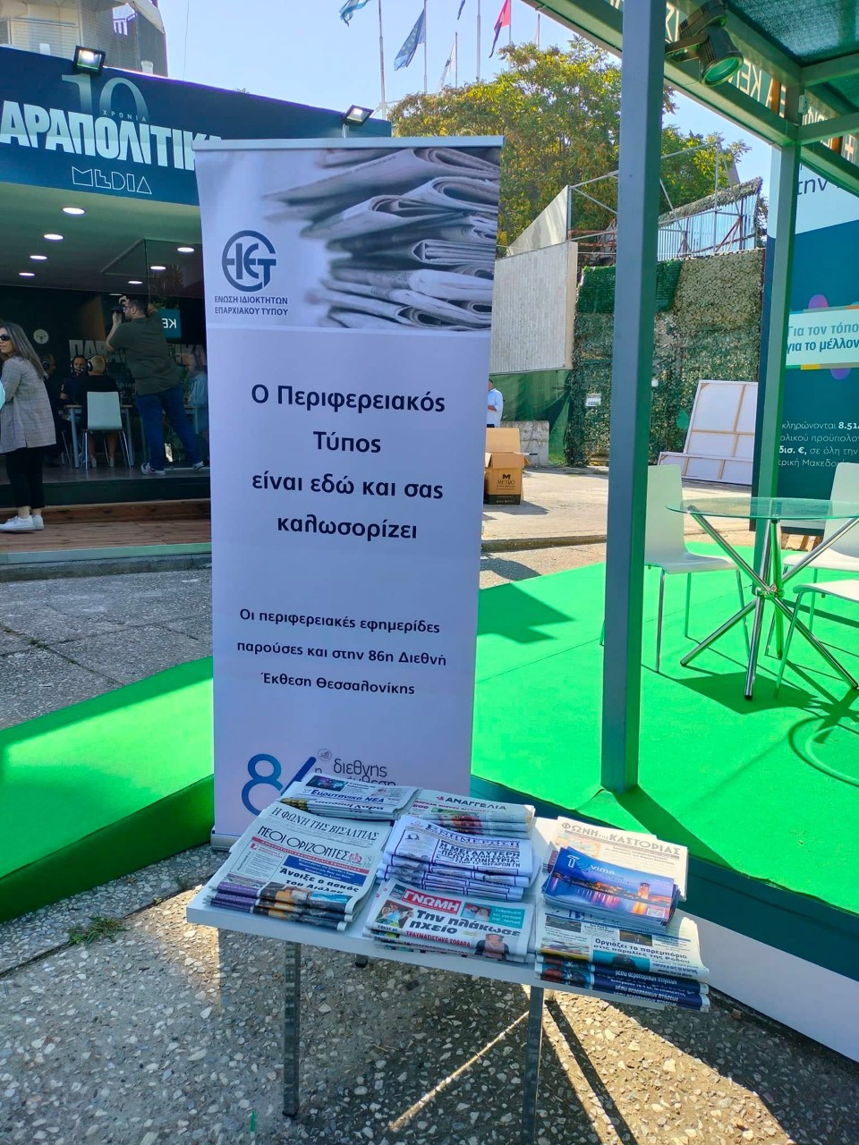 Για πρώτη φορά η Ένωση Ιδιοκτητών Επαρχιακού Τύπου έχει τον δικό της χώρο στη Διεθνή Έκθεση Θεσσαλονίκης. Και μάλιστα στην είσοδο της 86ης ΔΕΘ, σε χώρο που ευγενικά μας παραχώρησε η Περιφέρεια Κεντρικής Μακεδονίας.
