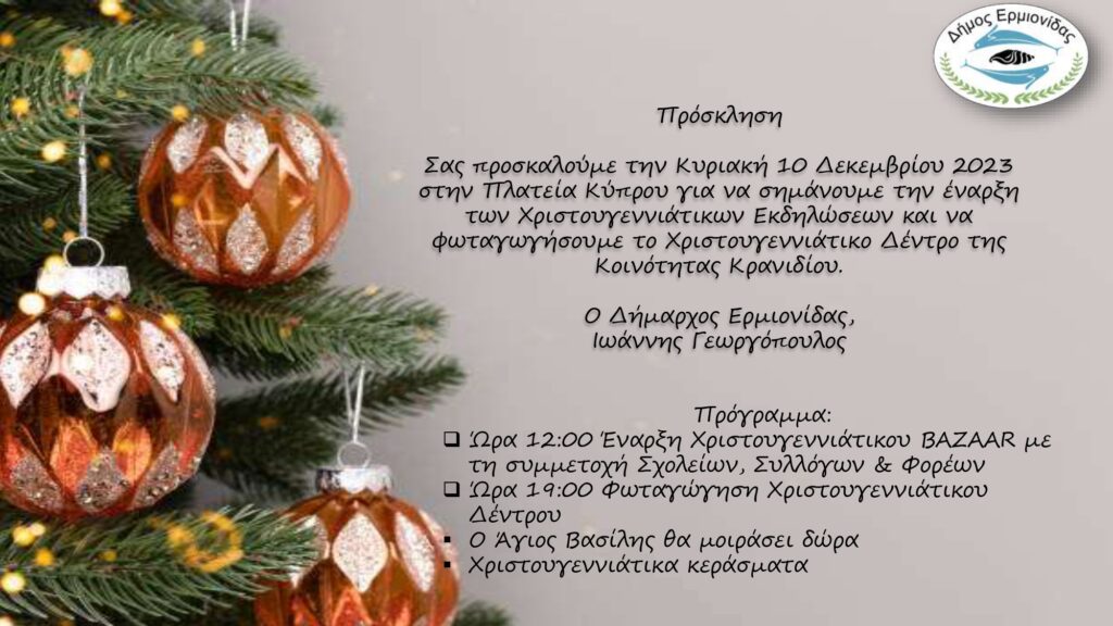 Την Κυριακή 10 Δεκεμβρίου 2023, στην Πλατεία Κύπρου στο Κρανίδι, θα σημάνει η έναρξη των Χριστουγεννιάτικων Εκδηλώσεων και θα φωταγωγηθεί το Χριστουγεννιάτικο Δέντρο της Κοινότητας Κρανιδίου.