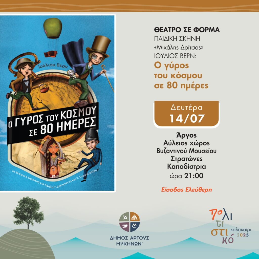 Απόψε Δευτέρα 14 Ιουλίου (21:00) η Παιδική Σκηνή “Μιχάλης Δρίτσας” από το ‘’ΘΕΑΤΡΟ σε ΦΟΡΜΑ’’ έρχεται στον Αύλειο χώρο του Βυζαντινού Μουσείου (Στρατώνες Καποδίστρια) στο Άργος, με το έργο “Ο γύρος του κόσμου σε 80 ημέρες”.