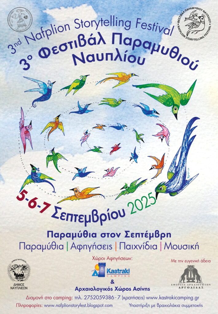 Με ιδιαίτερη χαρά ανακοινώνουμε και σας προσκαλούμε στο 3ο Φεστιβάλ Παραμυθιού Ναυπλίου το οποίο θα πραγματοποιηθεί από την Παρασκευή 5 , Σάββατο 6 ,και Κυριακή 7 Σεπτεμβρίου 2025, στο κάμπινγκ «Καστράκι» και στον Αρχαιολογικό χώρο της Ασίνης.
