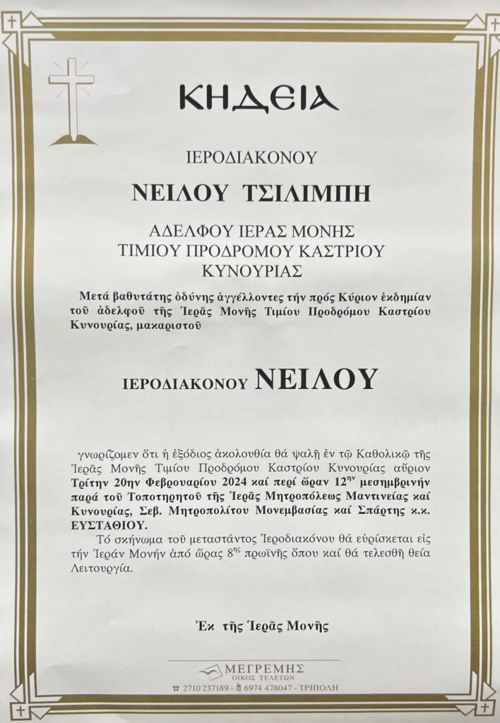 Τήν τελευταία του πνοή ἄφησε σήμερα Δευτέρα 19/2/2024 στό Παναρκαδικό Νοσοκομεῖο Τριπόλεως ὁ Ἱεροδιάκονος τῆς Ἱερᾶς Μονῆς Τιμίου Προδρόμου Καστρίου Κυνουρίας Νεῖλος Τσιλιμπῆς, Κληρικός τῆς Ἱερᾶς Μητροπόλεως Μαντινείας καί Κυνουρίας, σέ ἡλικία 70 ἐτῶν.