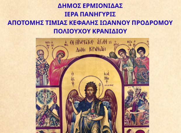 Το πρόγραμμα του εορτασμού της Αποτομής Τιμίας Κεφαλής του Ιωάννου Προδρόμου, Πολιούχου Κρανιδίου, ανακοίνωσε ο Δήμος Ερμιονίδας.