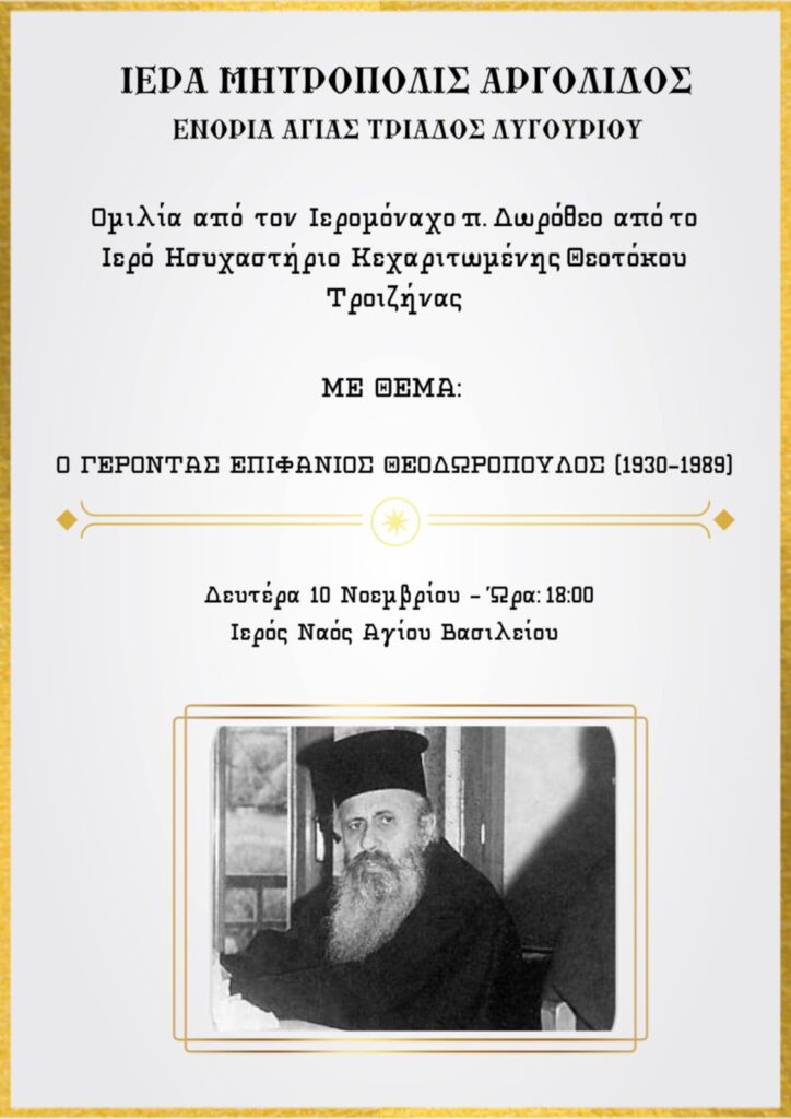 Ι.Ν. Αγίας Τριάδος Λυγουριού: Ομιλία με θέμα «Ο Γέροντας Επιφάνιος Θεοδωρόπουλος (1930 – 1989»