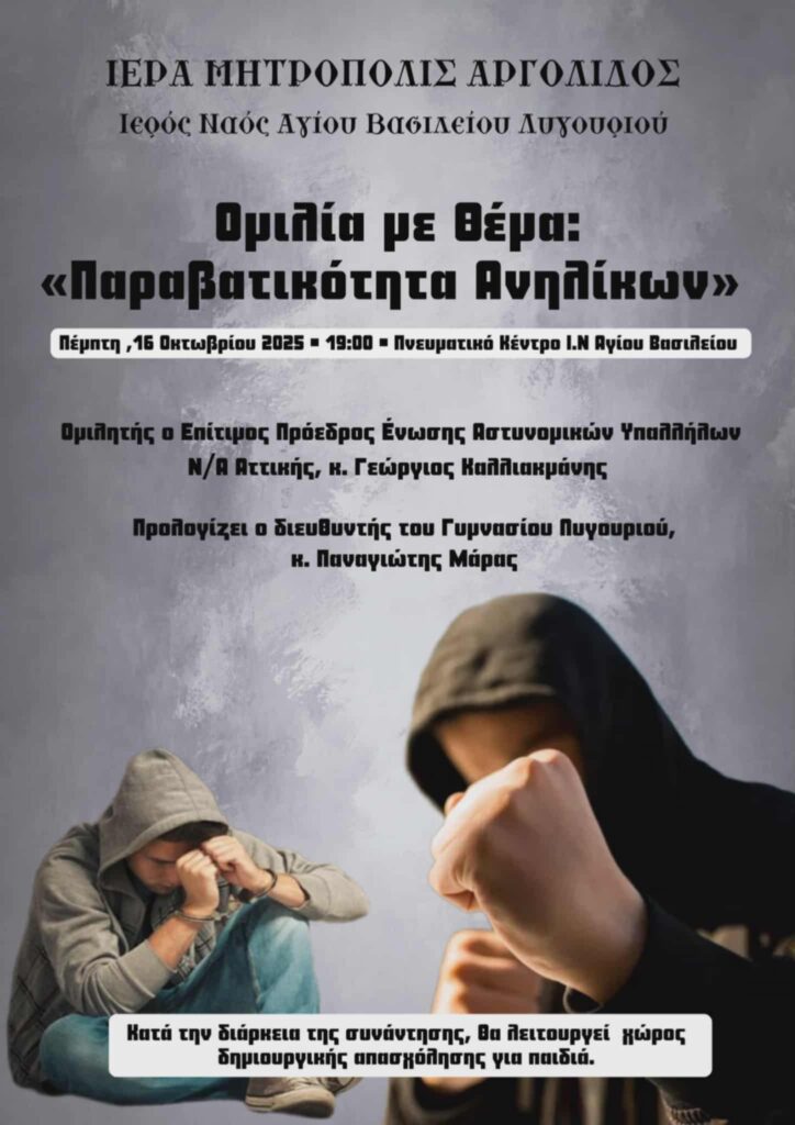 Συνεχίζοντας τον κύκλο των ομιλιών πνευματικού και όχι μόνο περιεχομένου, το Εκκλησιαστικό Συμβούλιο προγραμμάτισε ομιλία με θέμα την “Παραβατικότητα ανηλίκων”, την Πέμπτη 16 Οκτωβρίου 2025 και ώρα 19:00΄ στο Πνευματικό Κέντρο Αγίου Βασιλείου στο Λυγουριό, με ομιλητή τον Επίτιμο Πρόεδρο της Ένωσης Αστυνομικών υπαλλήλων Ν/Α Αττικής κ. Γεώργιο Καλλιακμάνη.