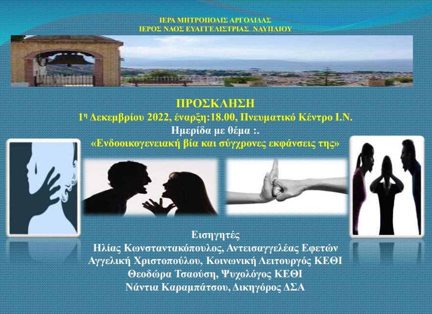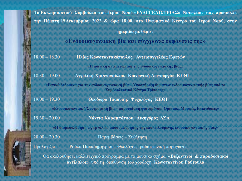 Το Εκκλησιαστικό Συμβούλιο του Ιερού Ναού «ΕΥΑΓΓΕΛΙΣΤΡΙΑΣ» Ναυπλίου, σας προσκαλεί την Πέμπτη 1η Δεκεμβρίου 2022 και ώρα 18:00, στο Πνευματικό Κέντρο του Ιερού Ναού, στην ημερίδα με θέμα: «Ενδοοικογενειακή βία και σύγχρονες εκφάνσεις της ».