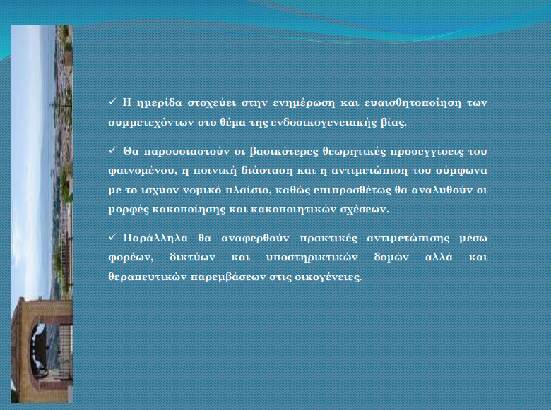 — Η ημερίδα στοχεύει στην ενημέρωση και ευαισθητοποίηση των συμμετεχόντων στο θέμα της ενδοοικογενειακής βίας.