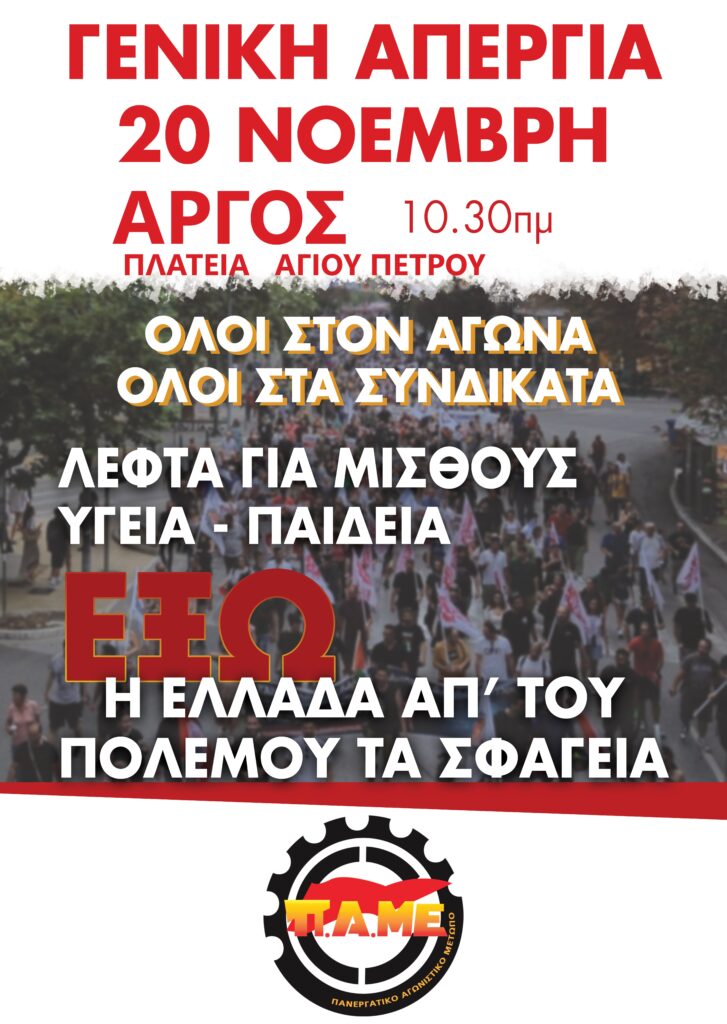 Κάλεσμα στην απεργιακή συγκέντρωση στο Άργος από το Σωματείο Ιδιωτικών Υπαλλήλων Αργολίδας