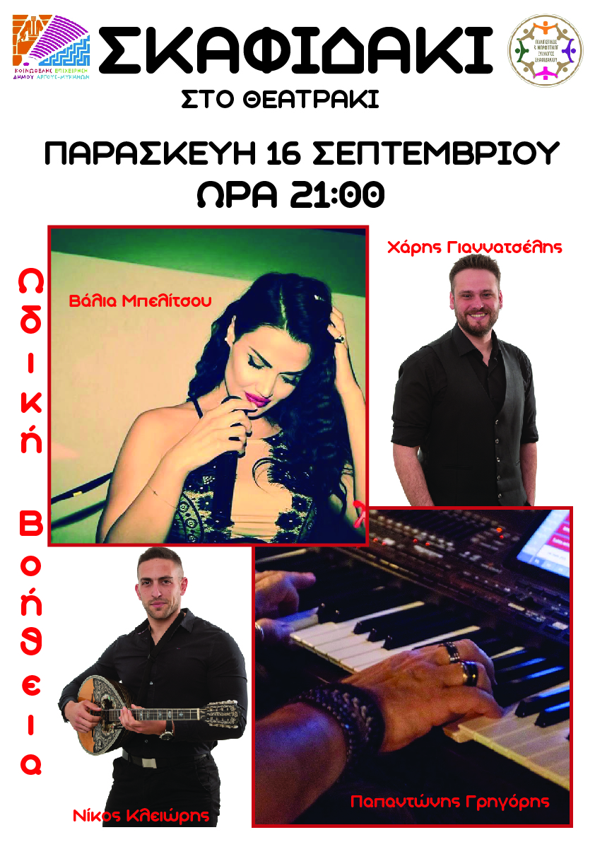 Ο Μορφωτικός και Πολιτιστικός σύλλογος Σκαφιδακίου σε συνδιοργάνωση με την ΚΕΔΑΜ σας καλούν σήμερα, Παρασκευή 16 Σεπτεμβρίου, το βράδυ στις 9 στο θεατράκι σε μια Μουσική Βραδιά με το συγκρότημα «Ωδική Βοήθεια».