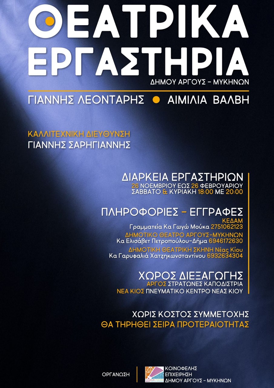 Ο Δήμος Άργους-Μυκηνών με την επίβλεψη της ΚΕΔΑΜ ανακοινώνει τα Θεατρικά Εργαστήρια του Δημοτικού Θεάτρου Άργους-Μυκηνών και της Δημοτικής Θεατρικής Σκηνής Νέας Κίου που θα διεξαχθούν από 26 Νοεμβρίου 2022 έως 26 Φεβρουαρίου 2023, Σάββατο και Κυριακή, 6-8μμ.