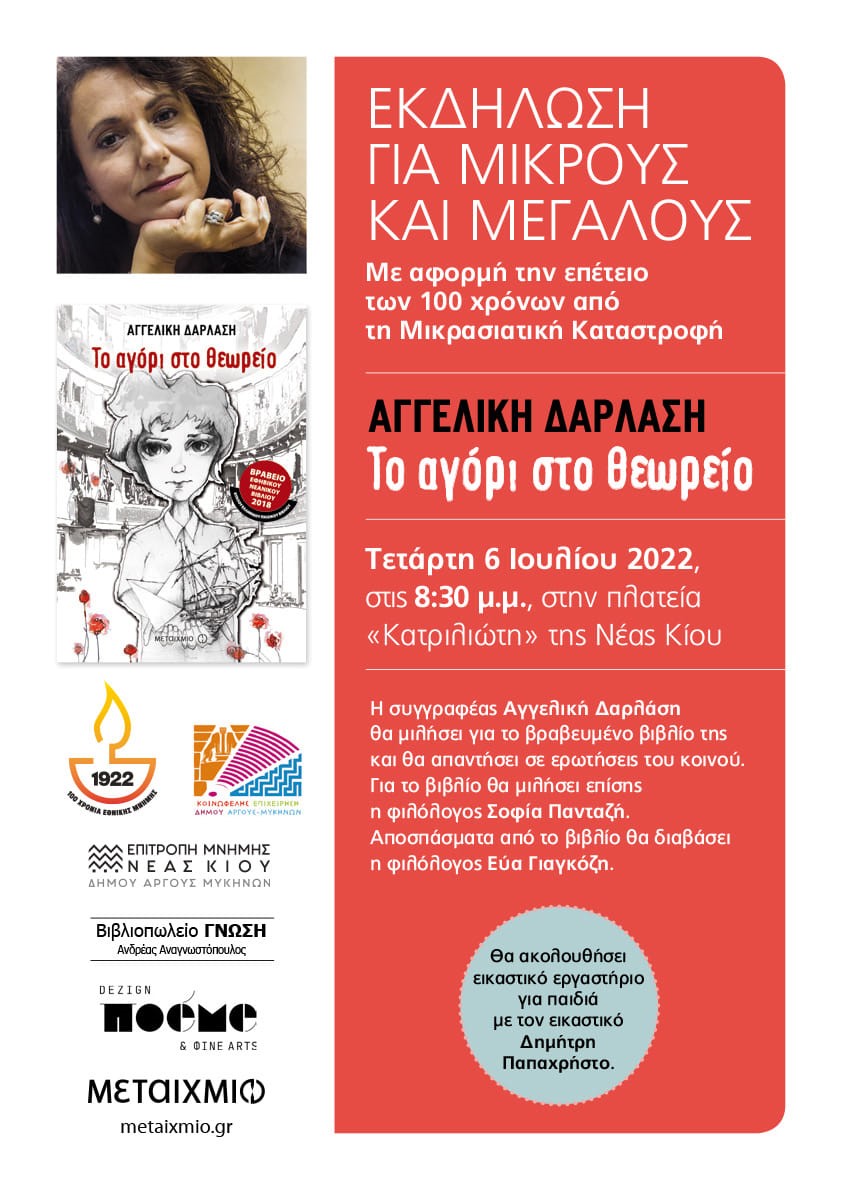Η Επιτροπή Μνήµης Νέας Κίου ∆ήµου Άργους Μυκηνών, για τα 100 χρόνια από τη Μικρασιατική Καταστροφή, η ΚΕ∆ΑΜ, το βιβλιοπωλείο ΓΝΩΣΗ και οι εκδόσεις ΜΕΤΑΙΧΜΙΟ, παρουσιάζουν το πολυβραβευµένο µυθιστόρηµα της Αγγελικής ∆αρλάση “ΤΟ ΑΓΟΡΙ ΣΤΟ ΘΕΩΡΕΙΟ”.