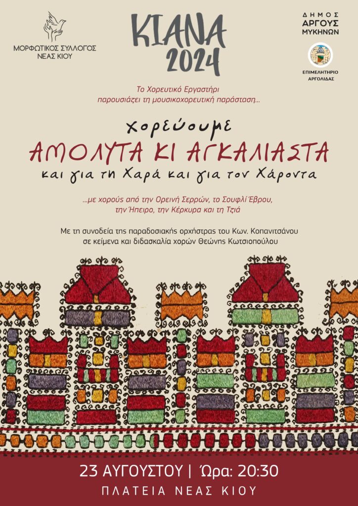Ο Μορφωτικός Σύλλογος Νέας Κίου ολοκληρώνει τις φετινές εκδηλώσεις των ΚΙΑΝΩΝ 2024 την Παρασκευή στις 23 Αυγούστου στις 8.30, στην πλατεία της Νέας Κίου, με τη Μουσικοχορευτική Παράσταση του Χορευτικού Εργαστηρίου του Συλλόγου, που έχει τον τίτλο «Χορεύουμε ΑΜΟΛΥΤΑ κι ΑΓΚΑΛΙΑΣΤΑ και για τη Χαρά και για τον Χάροντα».