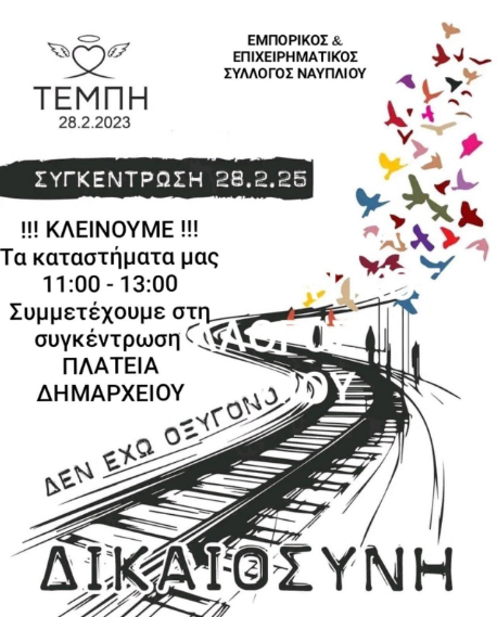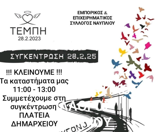 Κλείνουν τα εμπορικά καταστήματα στο Ναύπλιο, την Παρασκευή 28 Φεβρουαρίου κατά τη διάρκεια των κινητοποιήσεων για την τραγωδία των Τεμπών, με απόφαση του Εμπορικού και Επιχειρηματικού Συλλόγου Ναυπλίου.