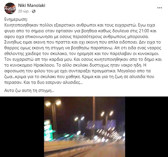 Κινητοποιηθηκαν πολλοι εξαιρετικοι ανθρωποι και τους ευχαριστώ. Εγω ειχα φυγει απο το σημειο οταν εφτασαν για βοηθεια καθως δουλευα στις 21:00 και αφου ειχα επικοινωνησει με οσους περισσότερους ανθρωπους μπορουσα. Συνηθως ειμαι εκεινη που πραττει και οχι εκεινη που απλα ειδοποιει. Δεν ειχα το θαρρος ομως εκεινη τη στιγμη να βοηθησω παραπανω. Απ οτι ειδα ενας νεαρος εθελοντης χαιδεψε τον σκυλακο, τον ηρεμησε και τον παρελαβαν οι κυνοκομοι. Τον ευχαριστώ απ την καρδια μου. Και οσους κινητοποιηθηκαν απο το δημο και το κυνοκομειο Ηρακλειου. Το αλλο σκυλακι δυστυχως ηταν νεκρο ηδη. Η αφοσιωση του φιλου του με εχει συνταραξει πραγματικα. Μεγαλειο απο τα ζωα…κριμα για το σκυλακι που χαθηκε. Κριμα και για τη ζωη σε αλυσιδα που περασαν. Και τα δυο εσερναν αλυσιδες…