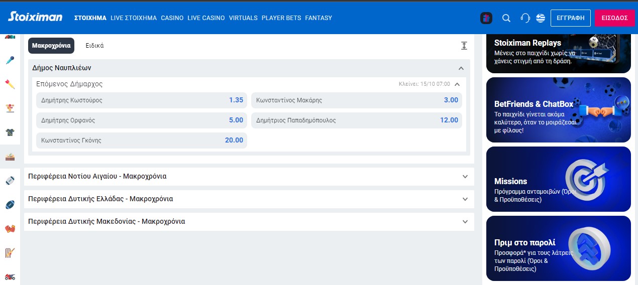 Ακόμα και οι μεγάλες στοιχηματικές εταιρείες όπως η stoiximan βλέπει με εντελώς διαφορετικό τρόπο τις δημοτικές εκλογές στο Ναύπλιο και όχι μόνο Οι αποδόσεις όπως είναι διαμορφωμένες σήμερα δίνουν ως μεγάλο φαβορί τον Δημήτρη Κωστούρο με απόδοση 1,35 ενώ ακολουθεί ο Κωνσταντίνος Μάκαρης με αποδοση 3,00 και πολύ πιο πίσω ο Δημήτρης Ορφανός με απόδοση 5,00 Στην ίδια στοιχηματική εμφανίζονται με μεγαλύτερες πιθανότητες νίκης ο Δημήτρης Καμπόσος και στην Περιφέρεια ο Δημήτρης Πτωχός