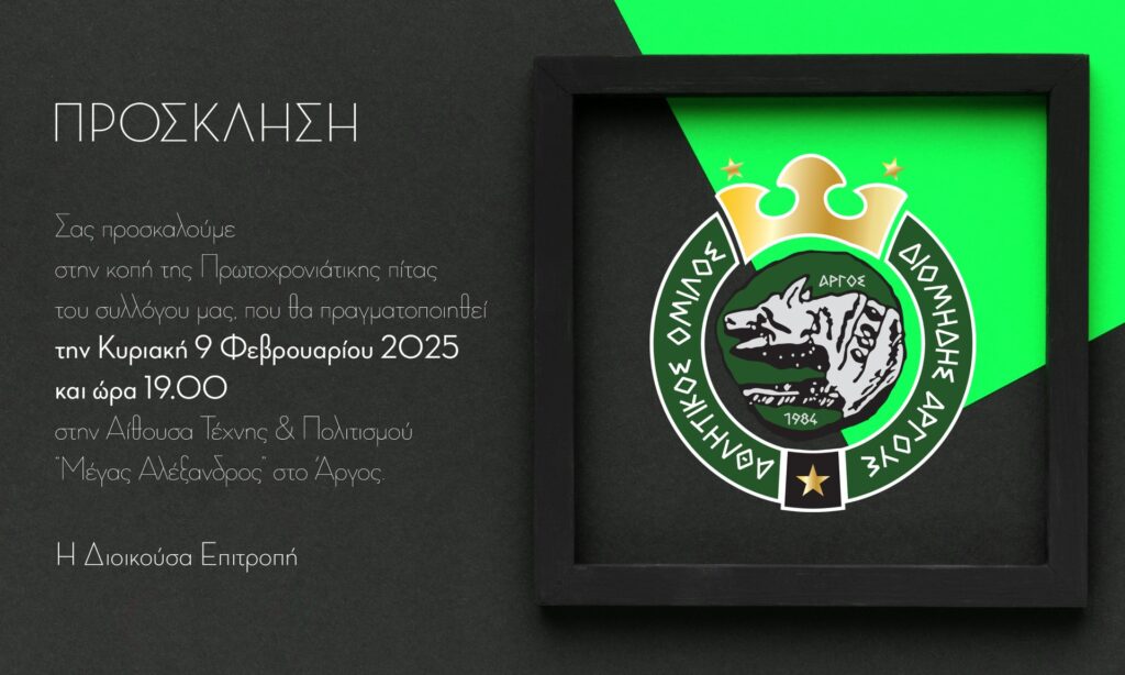 «Την Κυριακή 9 Φεβρουαρίου 2025 και ώρα 19:00, στην Αίθουσα Τέχνης και Πολιτισμού “Μέγας Αλέξανδρος” στο Άργος, θα πραγματοποιηθεί η κοπή της Πρωτοχρονιάτικης πίτας της ανδρικής ομάδας και των τμημάτων υποδομής του συλλόγου μας.