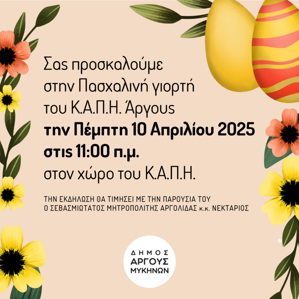 Το Κέντρο Ανοιχτής Προστασίας Ηλικιωμένων (Κ.Α.Π.Η.) του Δήμου Άργους – Μυκηνών προσκαλεί τα μέλη και τους φίλους του στην καθιερωμένη Πασχαλινή Γιορτή, που θα πραγματοποιηθεί την Πέμπτη 10 Απριλίου 2025, και ώρα 11:00 π.μ., στον φιλόξενο χώρο του Κ.Α.Π.Η. Άργους.